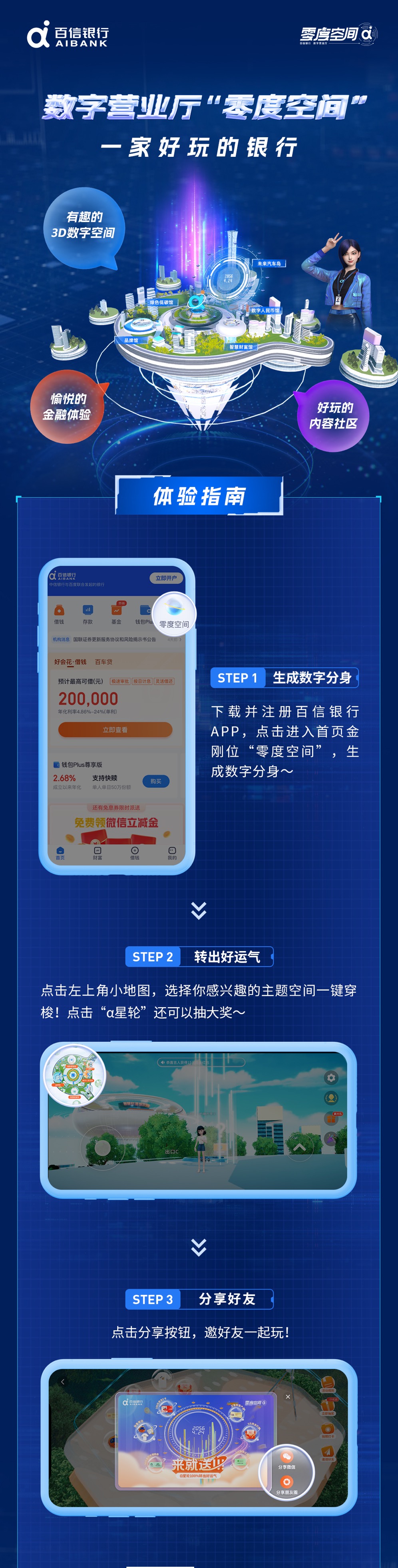 百信银行发布行业首个3D数字营业厅“零度空间”4月11日,“AI上逛银行”——百信银行数字营业厅“零度空间”产品发布会在新华媒体创意工场举行。百信银行行长李如东、新华网董事长刘健、百度副总裁李硕等领导嘉宾,以及众多生态合作伙伴出席发布会。会上,百信银行正式推出全新交互体验的3D数字营业厅——“零度空间”,该行的数字员工AIYA在活动现场参与互动并派发福利。 “零度空间”革新了传统银行的服务交互模式,在生成式人工智能技术的驱动下,通过构建更有趣的3D数字空间、打造更好玩的内容互动社区、营造更愉悦的金融体验三大产品亮点,为年轻用户提供全新的沉浸式数字金融服务。用户从百信银行APP首页进入“零度空间”,可以定制个性化、多模态的数字分身,实现与数字员工AIYA交流互动、购买专属理财产品、观看数字人直播、逛α星轮抽奖等全新极致体验。这既是百信银行对未来银行的一次全新探索,也是AIGC技术在数字银行的一次创新应用。 百信银行数字营业厅“零度空间”产品发布会现场 近年来,我国数字经济实现了跨越式发展,生成式人工智能技术发展提档加速,正在深刻影响着各行各业,信息交互形式、数字生产力和数字银行形态正在发生深刻变革。 “数字化是我们的开始,数智化则是百信银行的现在和未来,一字之差可能是一个代际的变化,甚至可能是一个时代的跨越。科技创新正在进入一个新的大航海时代,百信银行将始终坚持数字普惠金融初心,充分发挥金融科技创新优势,为数字经济和实体经济高质量发展贡献百信力量。”百信银行行长李如东表示。 活动上,百信银行数字员工AIYA揭晓了“最高1118元现金红包”“集度汽车ROBO1一年使用权抽奖活动”专属福利彩蛋。此外,“零度空间”还推出了“购买专属基金免手续费”的福利活动回馈广大用户。据了解,数字营业厅试营业首月,百信银行APP活跃度提升20%,用户平均登录时长超过15分钟。 |